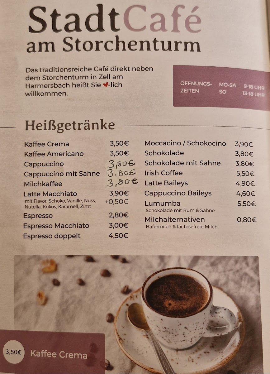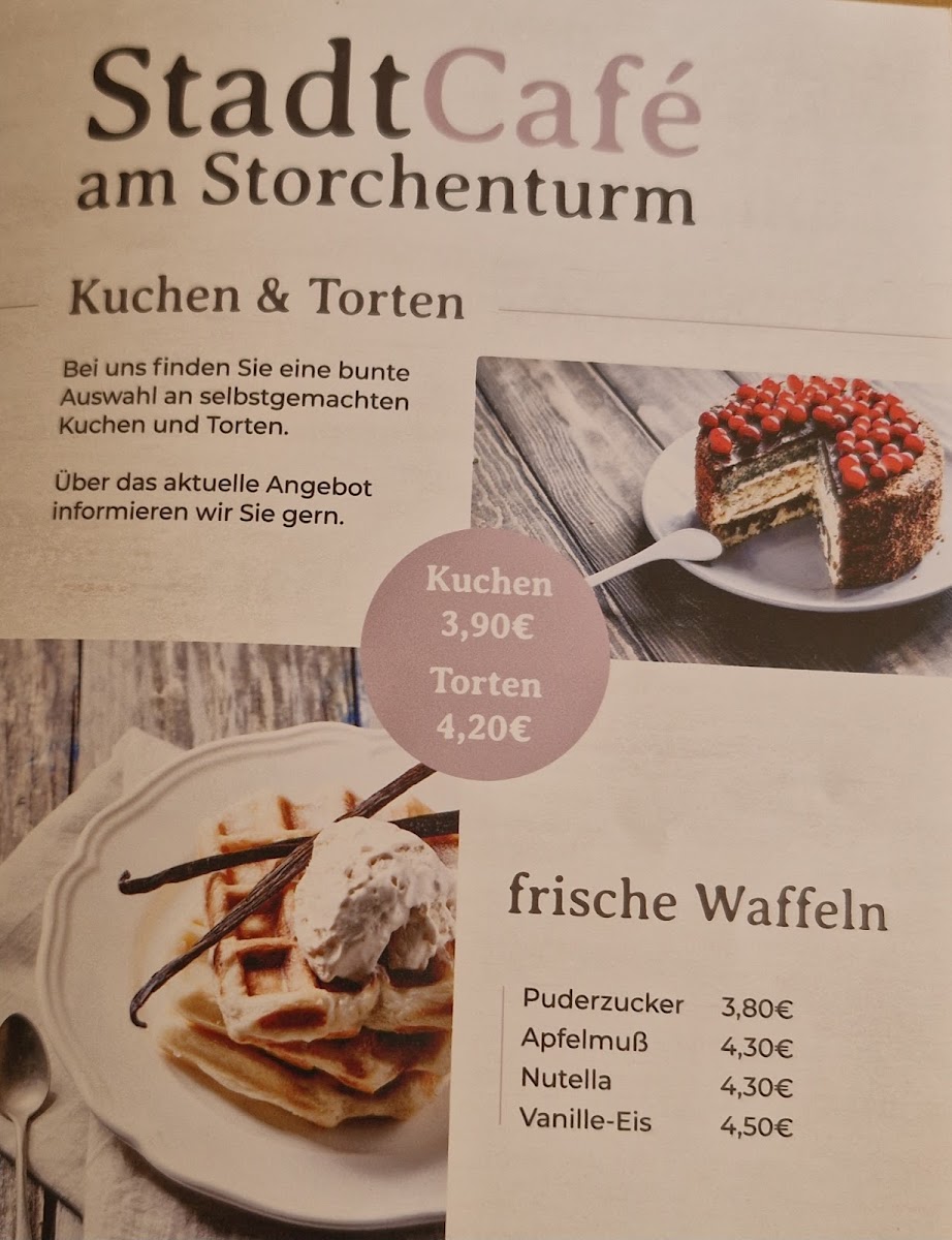 The menu at Stadtcafe am Storchenturm primarily features a selection of coffee beverages and a variety of cakes and pastries. Visitors can expect classic options such as cappuccino and hot chocolate, accompanied by an assortment of cakes including options with fruit fillings.